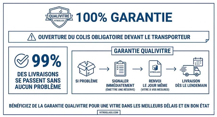 Comme vous le verrez sur votre bon de commande, pour que nos assurances prennent le relais, nous vous demandons de déballer le colis devant le transporteur, si il y a un problème vous devez lui signaler immédiatement et émettre une réserve. Une fois le problème signalé nous renvoyons une vitre d’insert à vos mesures le jour même pour une livraison dès le lendemain. Ainsi vous êtes assuré d’avoir votre vitre d’insert sur mesure dans les meilleurs délais et en bon état.