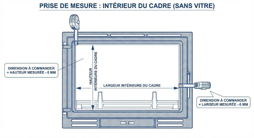 - Si la vitre est absente ou détruite : mesurez l’intérieur du cadre puis retirez 6 mm en hauteur et en largeur
